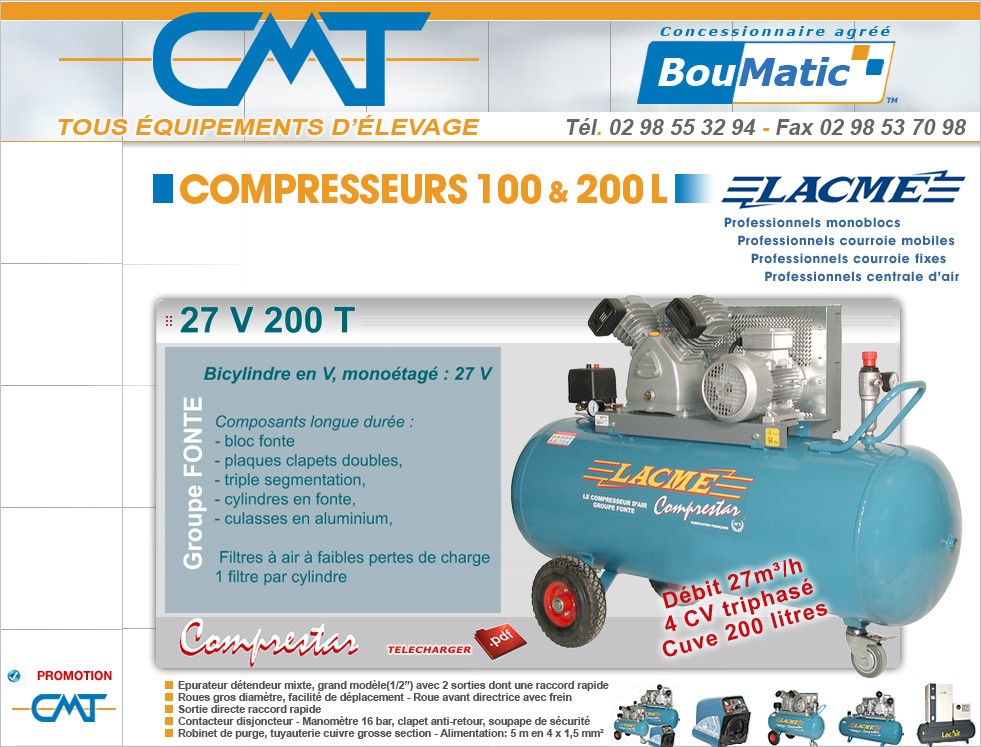 En exposition chez CMT - Les compresseurs LACME 100 et 200 litres. Des produits techniques spécifiques à destination des professionnels du monde agricole. A choisir en fonction de vos accessoires...